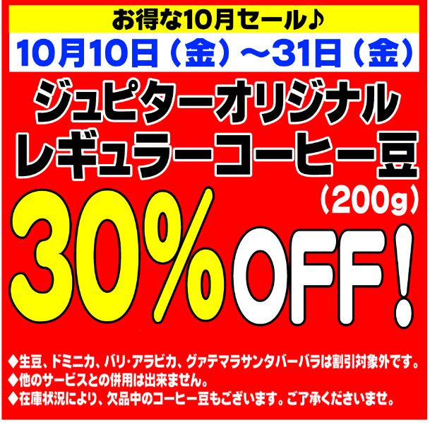 10月31日 ㈮ までジュピターレギュラーコーヒー豆の30%OFFセールを開催しております。