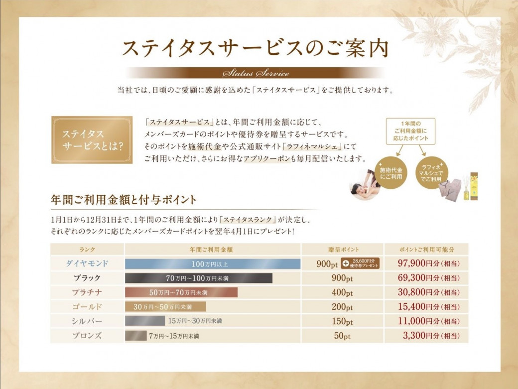 毎年、1月1日から12月31日までの1年間のご利用金額に応じて「ステイタス会員様」になって頂けます!「ステイタスランク」はご利用金額に応じて変わり、翌年度の4月1日から1年間がステイタス会員様となります。